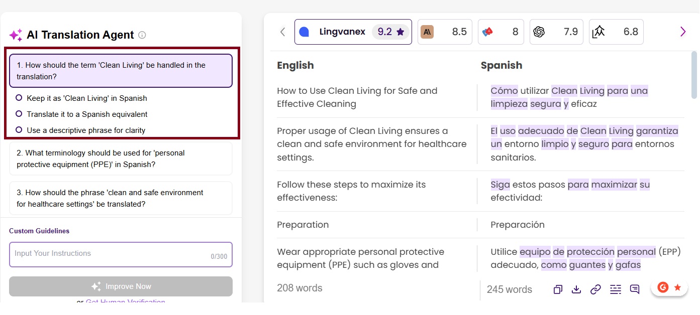 Additionally, our Key Term Translations feature helped identify critical medical terms. The last thing they wanted was for medical instructions to be misinterpreted due to poor translations. Our system ensured that key terms were precise, culturally appropriate, and aligned with industry standards.