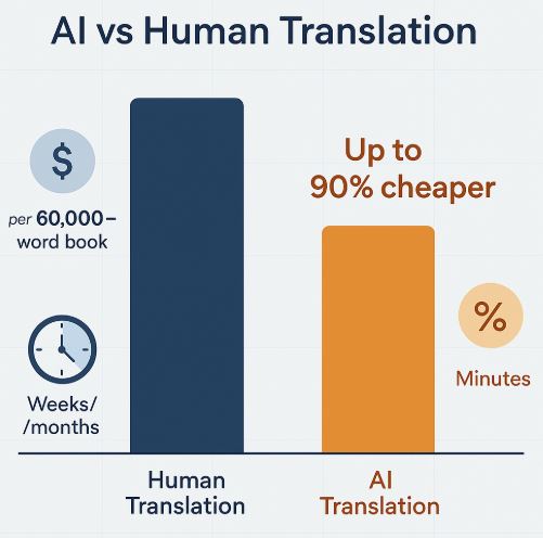 Let’s be honest: traditional translation services are expensive. Depending on the language and subject matter, translating a single 60,000-word book can cost upwards of $8,000–$15,000 when using human translators.
