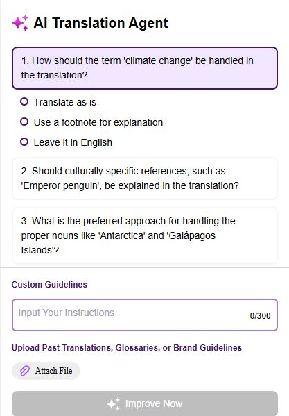 AI translation with memory and glossary support helps maintain linguistic integrity across long-form projects. Each translation builds on the last, creating a consistent experience from start to finish.