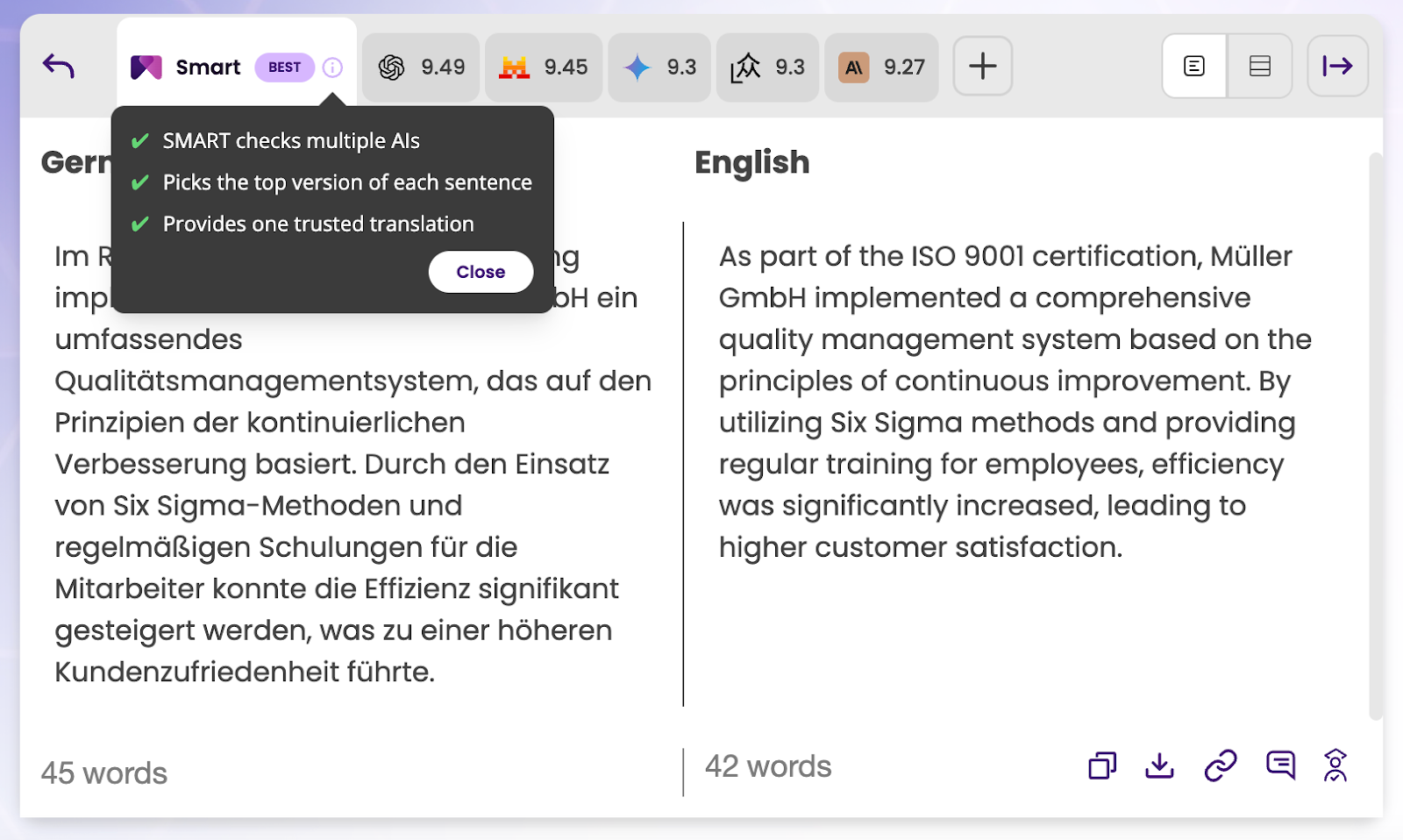 The Result: Users get a single, high-quality translation that combines the brainpower of all the top AI models. In early tests, users who used SMART spent 24% less time fixing errors than those who tried to pick an AI manually.