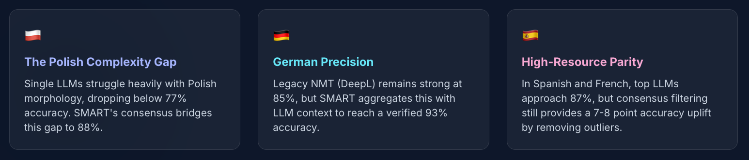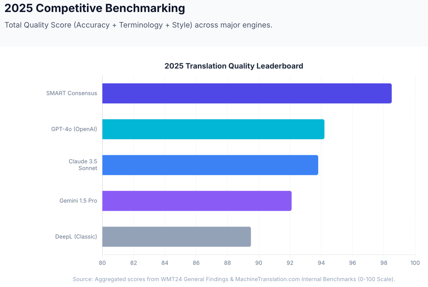 In MachineTranslation.com's internal benchmarks, individual top-tier models score 93â94 out of 100 on translation quality. SMART's consensus output reaches 98.5. The practical implication: instead of tracking which engine is best for each of your language pairs and content types, you get the cross-model agreed output in one step â along with a Translation Quality Score showing how strongly the models agreed. Source: MachineTranslation.com internal benchmarks and WMT24 General Machine Translation Findings.