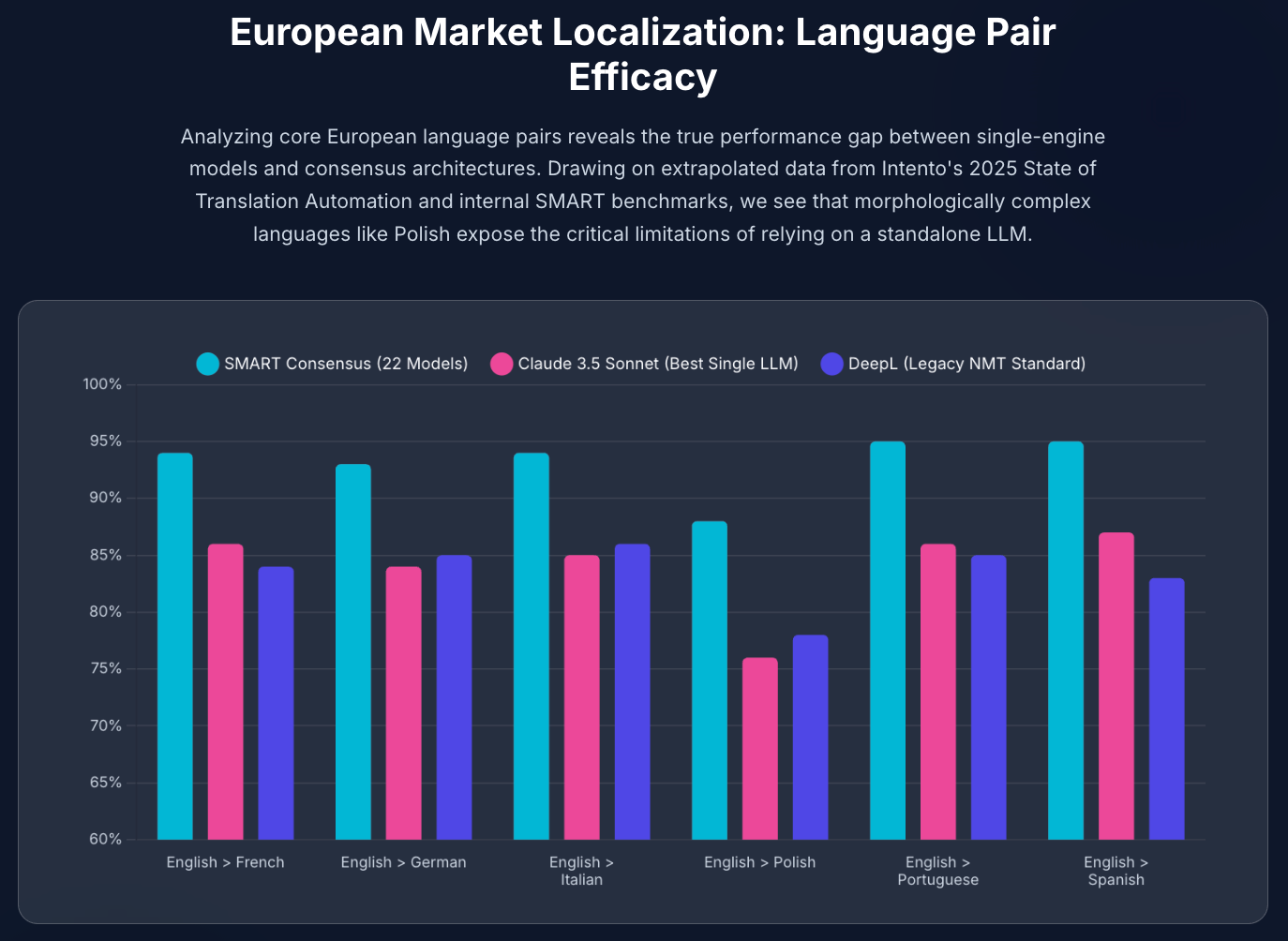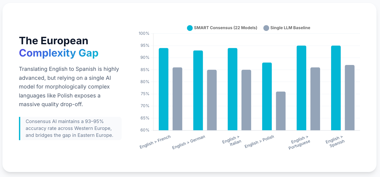 Polish is one of the clearest examples of the LLM advantage over traditional NMT. Polish morphological complexity (a large inflectional paradigm, complex case system) causes traditional NMT engines to produce errors that LLMs handle better. MachineTranslation.com's internal data shows single LLMs falling to around 76% accuracy for Polish, while consensus across 22 models boosts this to 88%. Source: Tomedes and Lokalise AI Translation Quality Research 2025 / MachineTranslation.com internal benchmarks.