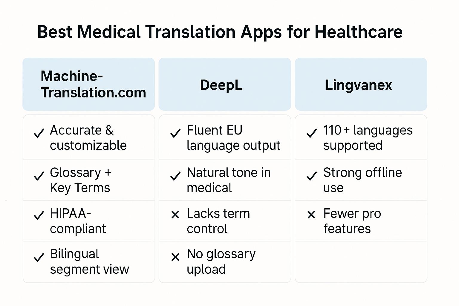 DeepL is great for translating European medical content with a natural tone, but it doesnât offer much customization. Lingvanex supports many languages and works offline, making it useful for healthcare workers in the field.