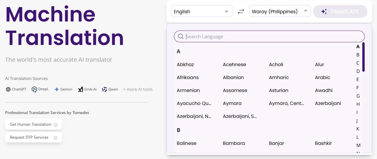 MachineTranslation supports a lot of low resource language such as Hiligaynon, Makassar, and Punjabi (Shahmukhi), means no market, culture, or community is left behindââ.