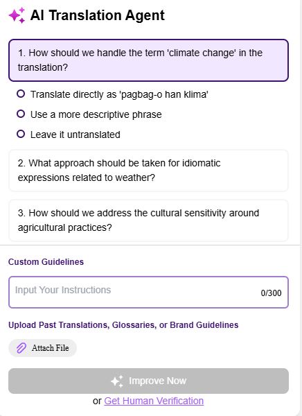It doesn't just translateâit collaborates. After you upload your text, it asks targeted questions about your tone, audience, and preferred style.