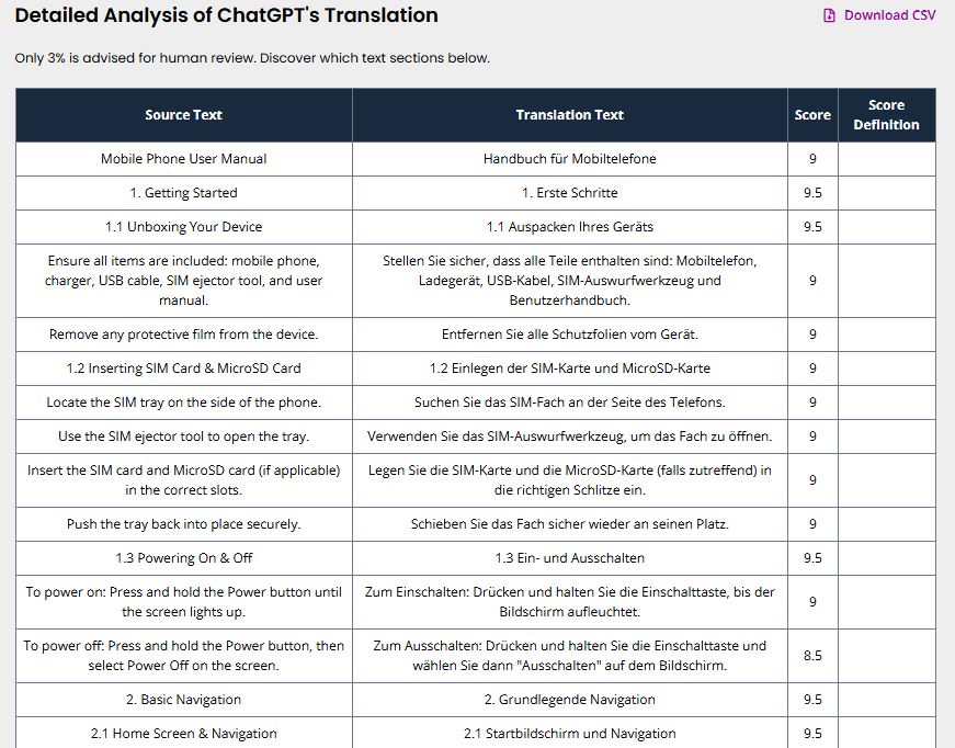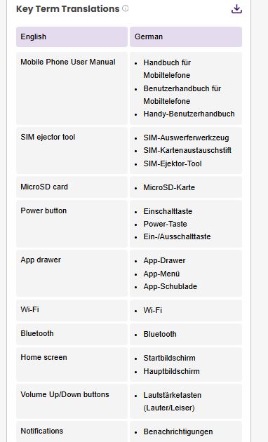 With Key Term Translations, the company ensured that important technical terms (e.g., “processor speed,” “battery optimization”) remained uniform across all materials. The AI automatically identified and standardized these terms, eliminating inconsistencies that could confuse users.