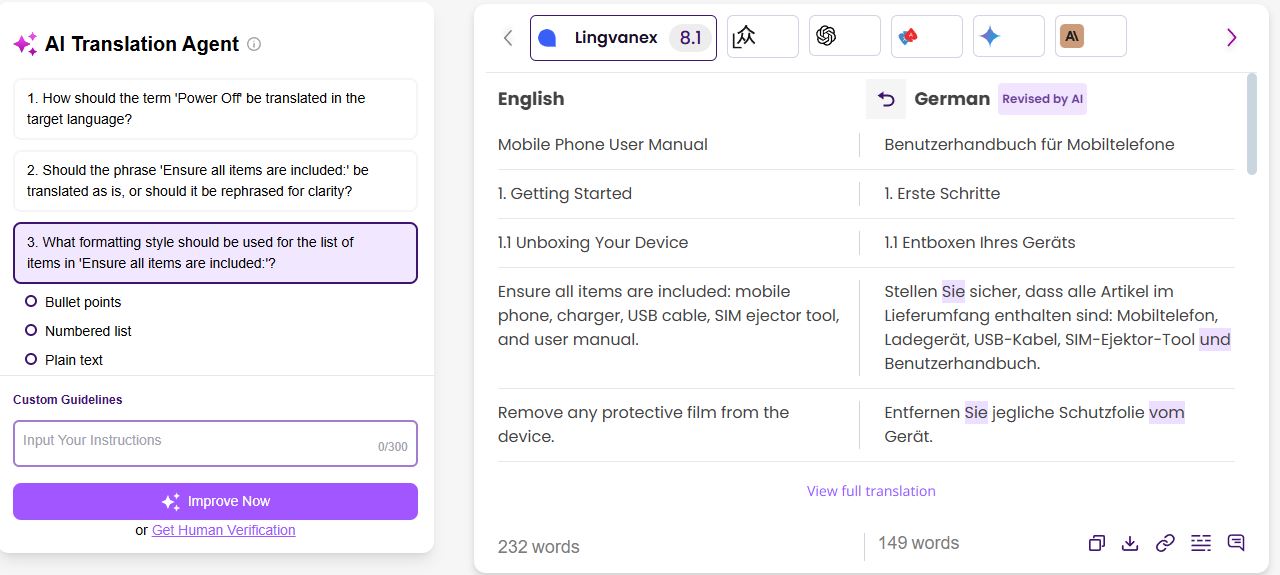 MachineTranslation.com’s Segmented Bilingual UI made it easy to edit and refine translations per segment, improving accuracy while saving time. Benefits included: