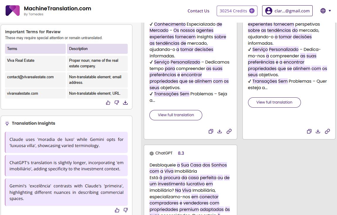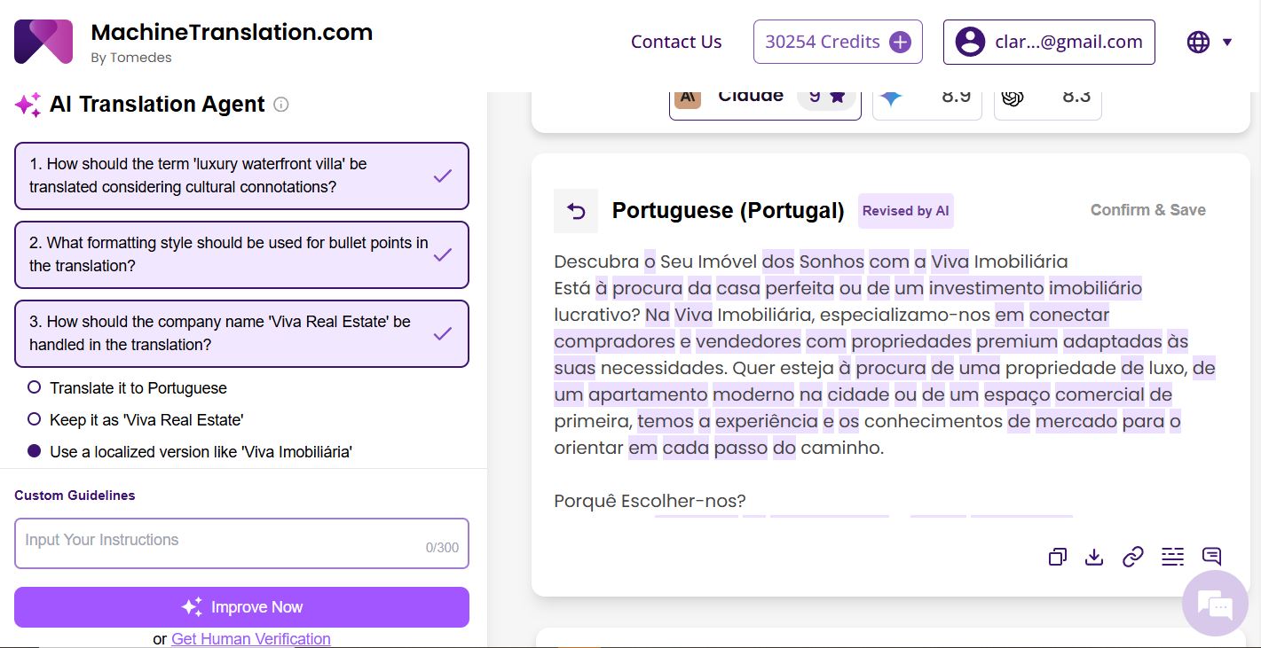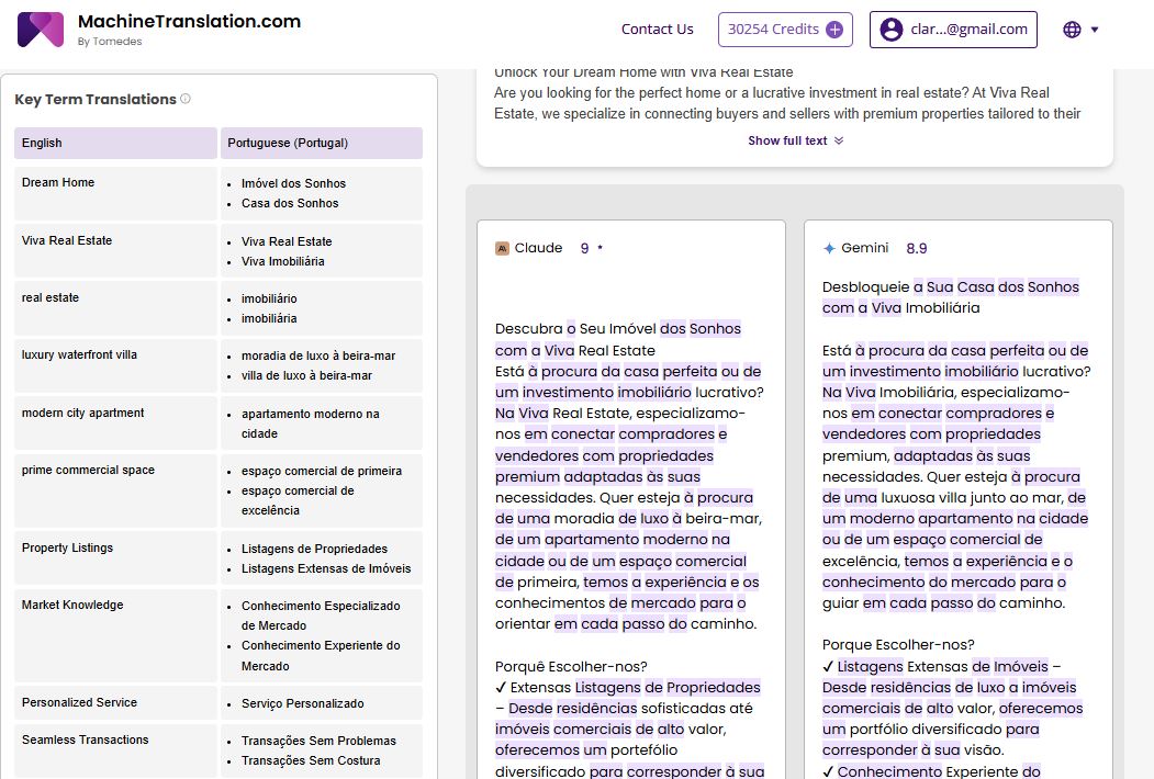 A major concern for businesses is translation accuracy. MachineTranslation.com provides quality scores for each translation, along with AI-driven recommendations for improvements. The real estate company could quickly verify translation accuracy without hiring additional reviewers.