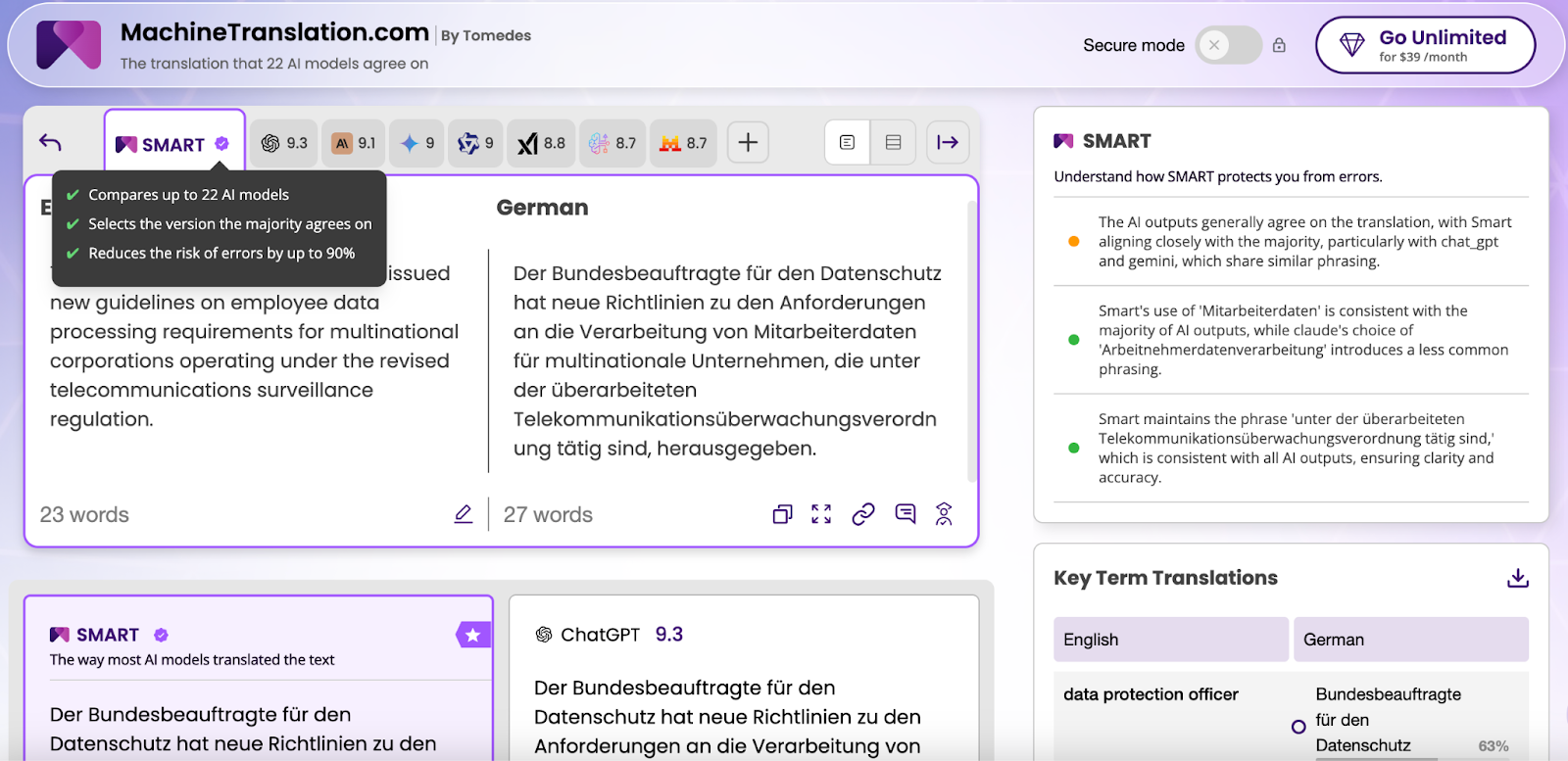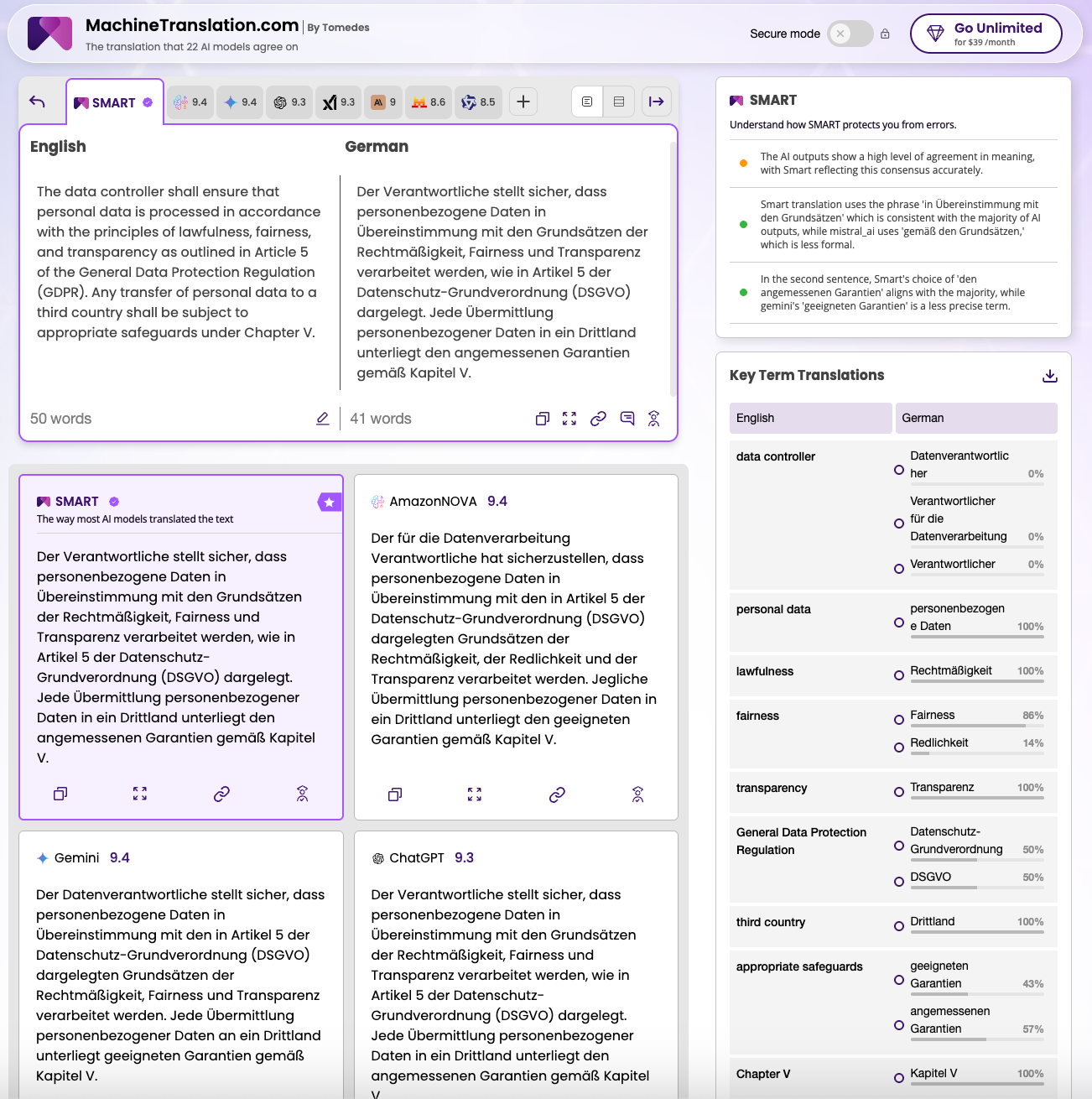 SMART compares up to 22 AI model outputs for the same text and identifies where they agree. For legal terms, this means you see exactly which terms have strong consensus (safe to use) and which have split opinions (need human review). Internal benchmarks show this approach reduces translation errors by up to 90% compared to single-model translation.
