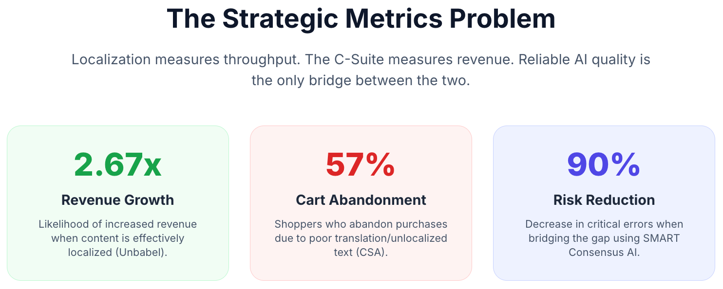 The workflow is: AI does the heavy lifting across 22 models, SMART identifies the reliable output, and human expertise is applied precisely where the data shows it is needed. This is the opposite of the traditional approach, where a human translates everything and hopes they chose the right term for each phrase.