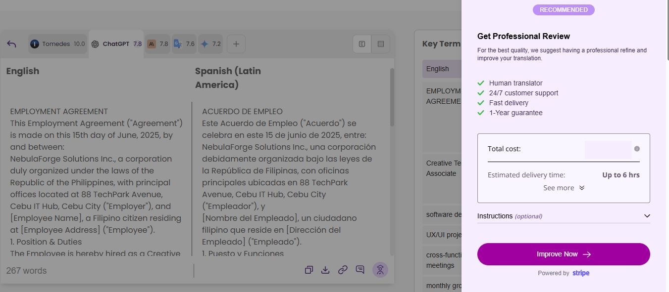 Prøv sikker modus risikofritt og se hvor enkel sikker oversettelse kan være. Du får fordelen av oversettelse med flere motorer, AI-assistert redigering og menneskelig sertifisering – alt på én sikker plattform. Utforsk sikker modus eller be om menneskelig sertifisering i dag, og slipp stresset med å oversette sensitivt innhold.