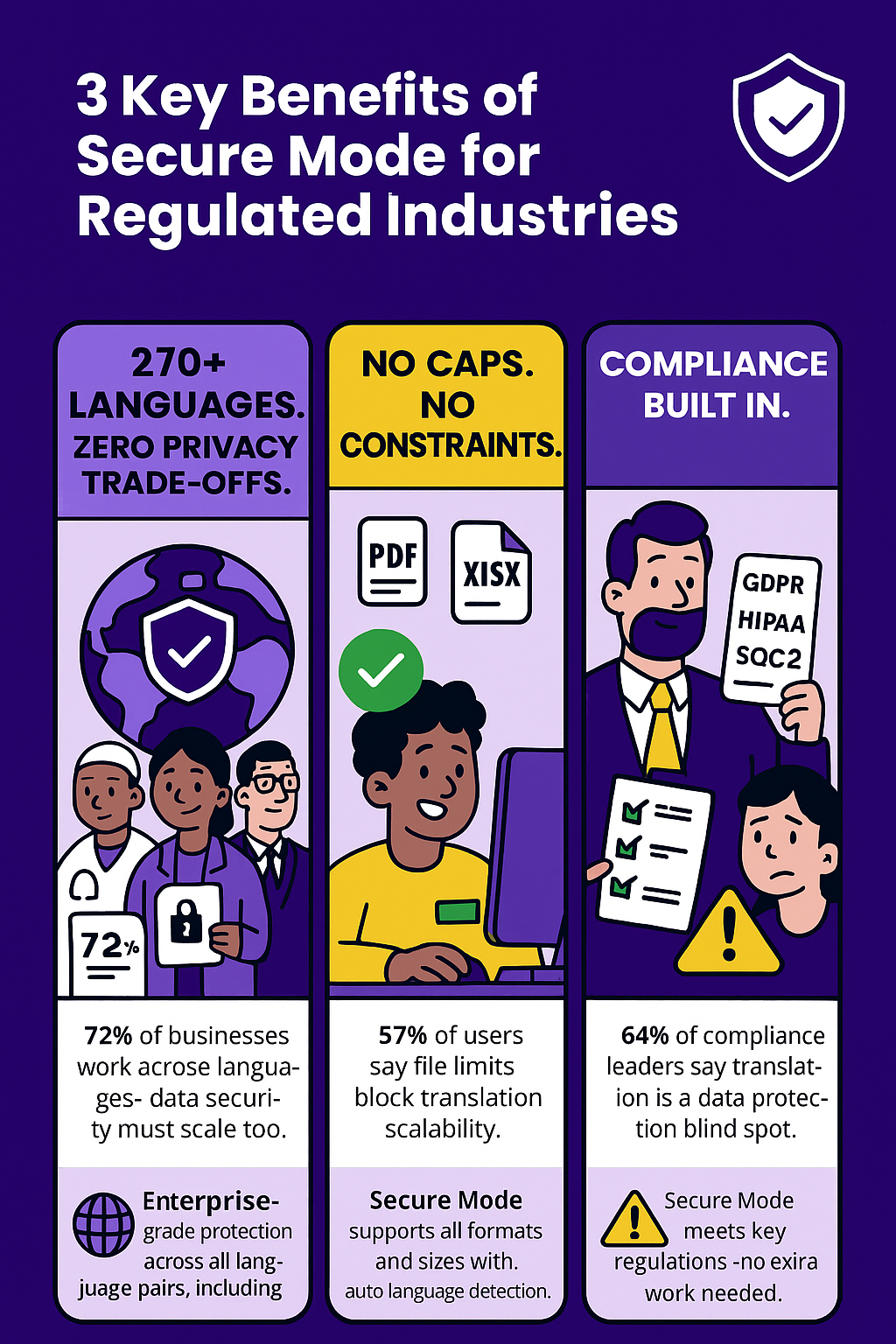 Hvordan kan bedrifter i regulerte bransjer sikre samsvar med oversettelsesregler? Start med en plattform som behandler personvern som kjerneinfrastruktur, ikke en sidefunksjon. Sikker modus hjelper organisasjoner med å oppfylle samsvarsforpliktelser i henhold til GDPR, HIPAA og SOC 2 ved å styre alle lag i oversettelsesprosessen.