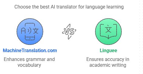 สำหรับนักเรียนและผู้เรียนภาษา โปรแกรมแปล AI อาจเป็นเครื่องมือที่มีค่าสำหรับการทำความเข้าใจคำศัพท์และโครงสร้างประโยคใหม่ๆ MachineTranslation.com และ Papago เป็นตัวเลือกที่ยอดเยี่ยมเพราะมีพจนานุกรมสองภาษาและรองรับคำศัพท์สำคัญ ตัวอย่างประโยค และการแปลตามบริบทที่ช่วยในการทำความเข้าใจ คุณลักษณะเหล่านี้ช่วยให้ผู้เรียนเข้าใจไวยากรณ์และคำศัพท์ได้ดีขึ้น พร้อมทั้งแปลเนื้อหาได้เป็นธรรมชาติมากขึ้น
