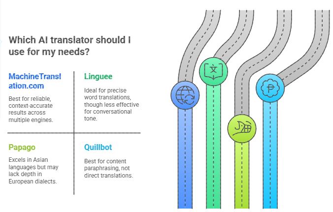 สำหรับความต้องการเฉพาะ โปรดพิจารณา Wordvice AI สำหรับสถาบันการศึกษา Papago สำหรับภาษาเอเชีย Quillbot สำหรับการปรับแต่งเนื้อหา และ HIX Translate สำหรับการแปลข้อมูลการเดินทางอย่างรวดเร็ว